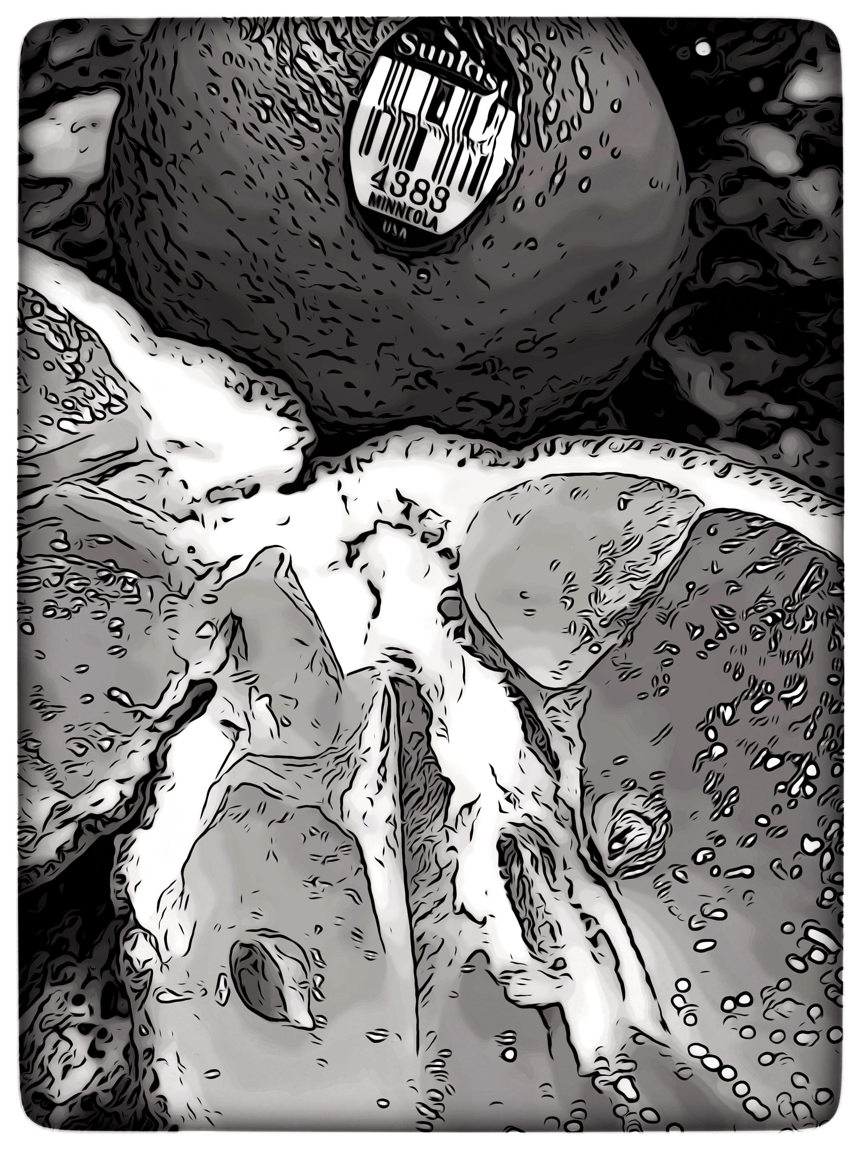 Now on today's sketch: while I disclaim any consumption of psychodelic substances today, I have to say the sketches must pull hard on some of the past instances. So does anyone else see the song bird's head protruding from the middle of the right grapefruit segment? Short beak, left eye staring at the viewer, feathers swept back across its crown, and slight streaking behind and below the eye?! Does Caliope have Photoshop skills?